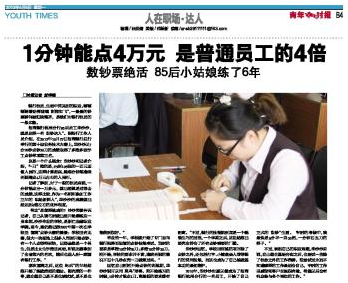 日前,《青年时报》、《新浪网》等媒体分别以“1分钟能点4万元,是普通员工的4倍”、“数钞票绝活 85后小姑娘练了6年”为主题专题报道了公司07届招商银行订单班员工华沙沙在点钞职业技能方面取得优异成绩,这是继bw必威西汉姆联官方网站毕业生在邮政系统技能竞赛中获得优异成绩后,又为优质金融银领人才订单人才培养增添了隆重的一笔。