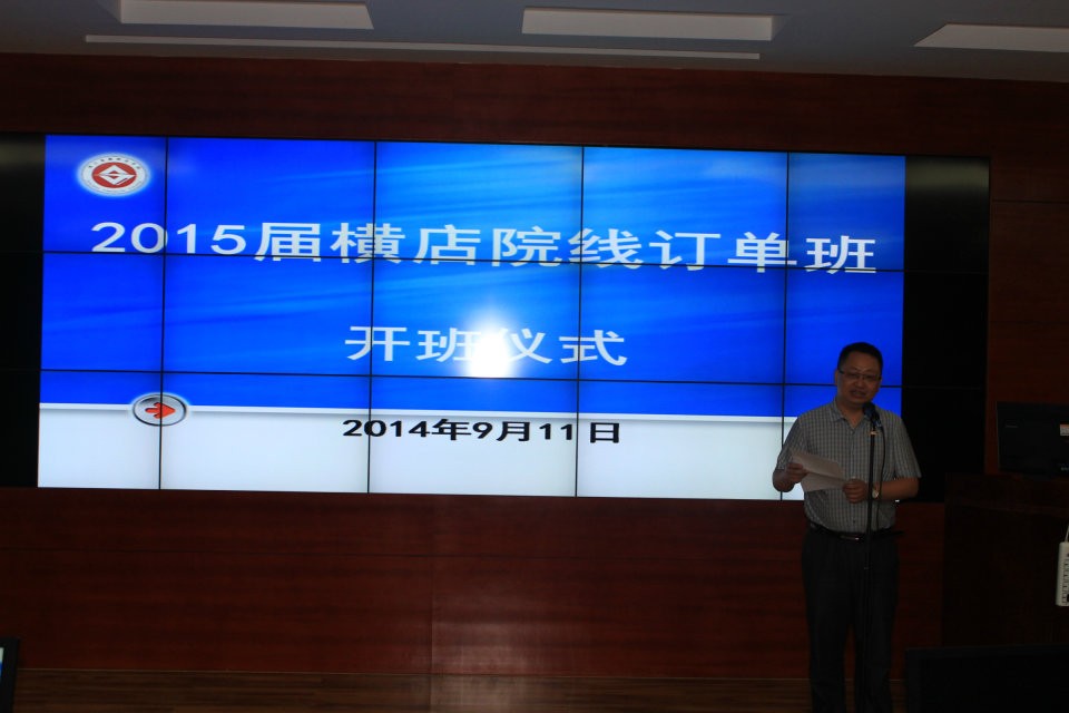 2014年9月11日下午,bw必威西汉姆联官方网站2015届横店院线订单班开班仪式在光大教学楼9205教室隆重举行。银领公司党总支书记、副经理王祝华,横店电影院线有限公司办公室主任兼人力资源部部长黄刚、办公室主任助理马军、职业培训中心主任姜玉玲等领导出席,横店院线订单班全体同学参加。开班仪式由横店院线订单班班主任孙淑萍老师主持。