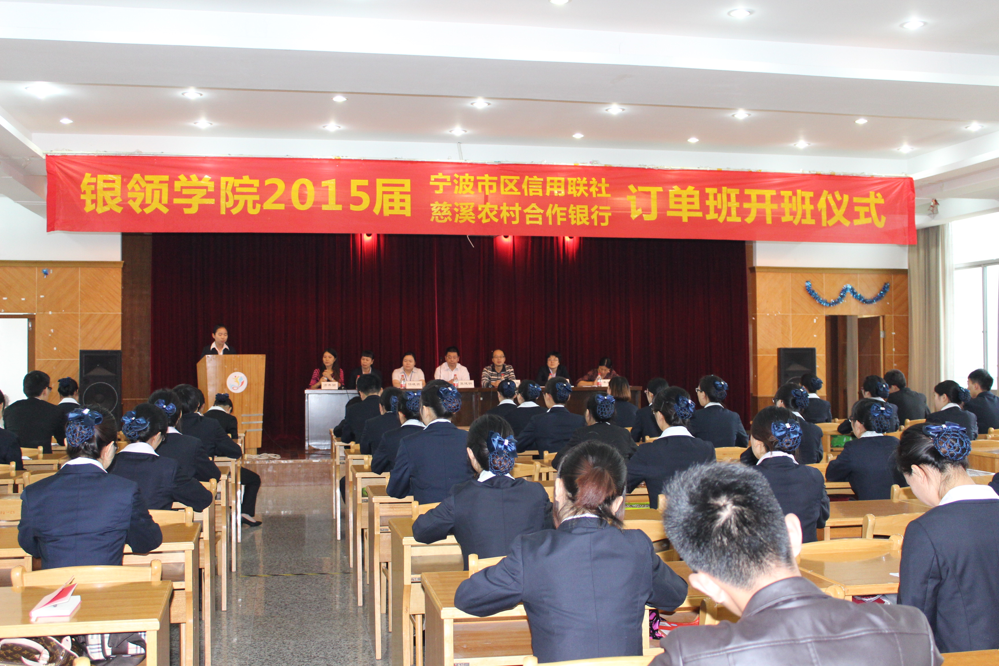 2014年9月19 日下午,bw必威西汉姆联官方网站2015届宁波市区农村信用联社、慈溪农村合作银行订单班在诚信讲学堂举行开班仪式。出席本次开班仪式的有银领公司党总支书记、副经理王祝华、bw必威西汉姆联官方网站经理助理方秀丽,宁波市区农村信用联社副主任张健钢、人力资源部总经理任晓燕,慈溪农村合作银行人力资源部总经理毛海雅、经理丁莹,订单班班主任牟君清以及两家订单班全体同学。仪式由方秀丽老师主持。