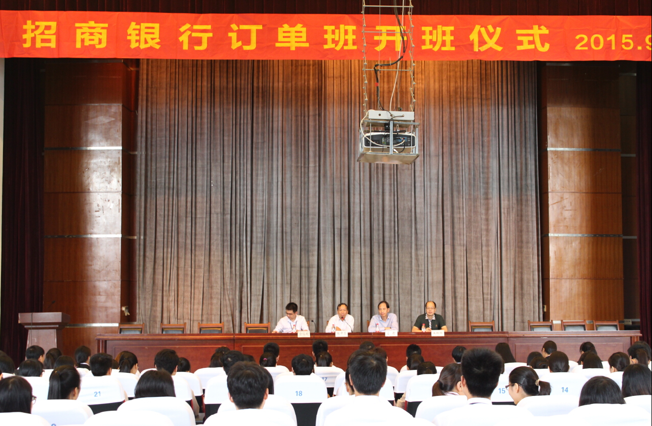 2015年9月23日下午,招商银行杭州分行副行长陈申生、人力资源部金慎超专程来到bw必威西汉姆联官方网站,出席2016届招商银行订单班开班仪式。bw必威西汉姆联官方网站党委副书记姜进、bw必威西汉姆联官方网站党总支书记王祝华、招行柜员班班主任牟君清、客服班班主任张慧欣及招商银行订单班的91位同学参加了仪式。开班仪式由王祝华主持。