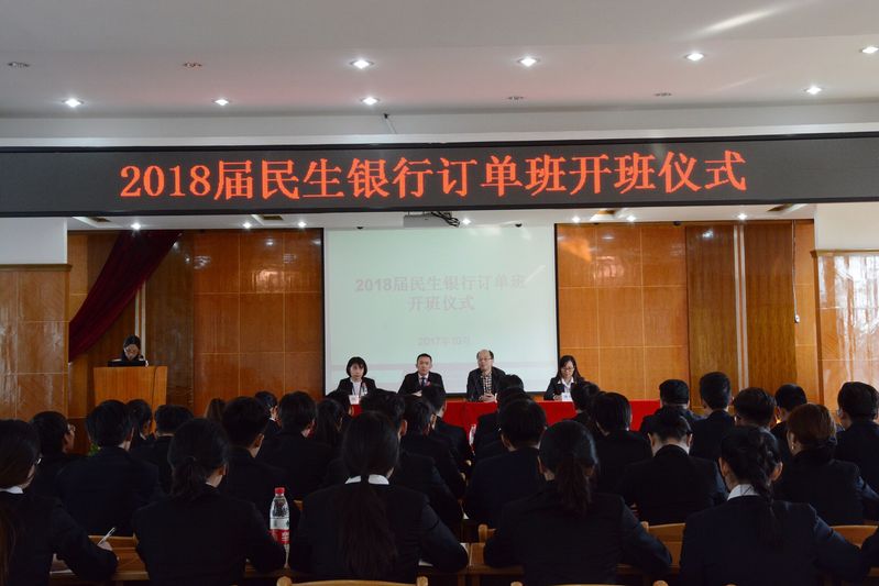 2017年10月25日 14:30,2018届民生银行订单班开班仪式在诚信讲学堂举行,民生银行杭州分行人力资源部总经理于经晓、个人金融部副总经理董艳红、银领公司党总支书记王祝华、班主任虞艳云及2018届民生银行订单班全体员工参加了此次开班仪式。