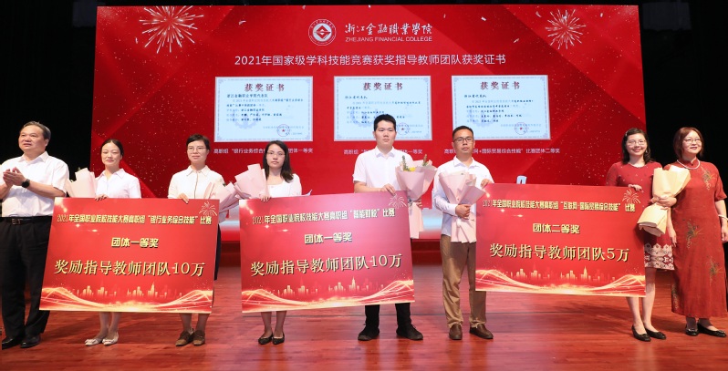 大会上,公司举行了各类先进的颁奖仪式。公司对指导员工参加全国职业院校技能大赛高职组“银行综合业务技能”比赛获团体一等奖的优秀指导教师章叶英老师进行隆重表彰,公司党委书记周建松、董事长郑亚莉代表公司向她颁发了证书和奖金;对获得公司“优秀教师”荣誉称号的缪仁亮老师、获得公司“优秀班主任”荣誉称号的徐烨老师进行隆重表彰,公司党委副书记王琦向他们颁发了证书。