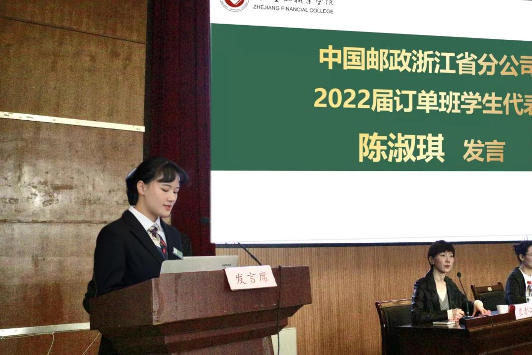 刘娅对同学们顺利进入中国邮政集团有限公司浙江省分公司订单班表示祝贺,并肯定了同学们的精神面貌。她介绍了中国邮政集团有限公司的发展历程及为大家提供的学习平台,希望同学们守正笃实,久久为功;终身学习,提升学历;保持热情,团结协作;适应逆境,勇往直前。