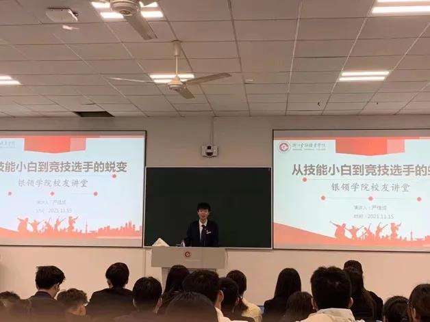 严佳成讲述了练习技能到传授技能的心路历程。他说道,在练习技能的道路上,只有勤奋才是唯一的捷径。刚开始在技能练习时遇到瓶颈,也产生过放弃的念头,直到后来参加了“技能之星”的颁奖仪式,看到技能尖子站在领奖台上,那种荣誉感和自豪感给了他很大的动力,自此开始勤练技能并在“众诚杯”比赛中拿到二等奖。渐入佳境后的他在学长学姐的带动下,养成每天练习技能的习惯。在大学三年时间里,随着身份的不断转变,接受了一个又一个的挑战,也因此拿到了国赛的入场券。现在的他,也感受到了技能优势带来的荣耀。