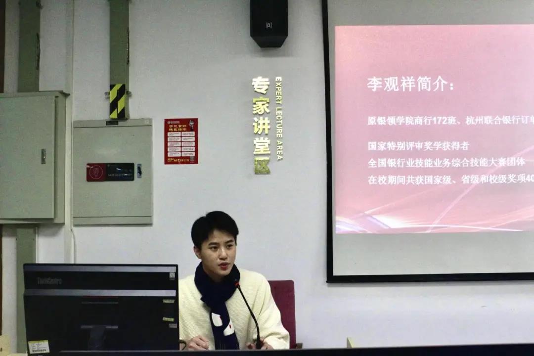 李观祥员工表达了对母校的感恩、对bw必威西汉姆联官方网站的感谢。他结合自身经历,从四个方面向杭州联合银行订单班的学员们分享了职场经验及心得,并给出了四点中肯的建议。一是明确技能的重要性,拥有好的技能将成为一大竞争优势,达到行业标准是第一步,在此基础之上还要做得更好。二是在校期间应多多考取证书,认真对待行里的考试,争取高分通过。三是要重视在不同岗位上得到的历练,寻找自己身上的亮点,提高营销本领。四是在上柜时要多听多看多问,遇到不懂的业务要大胆提问。