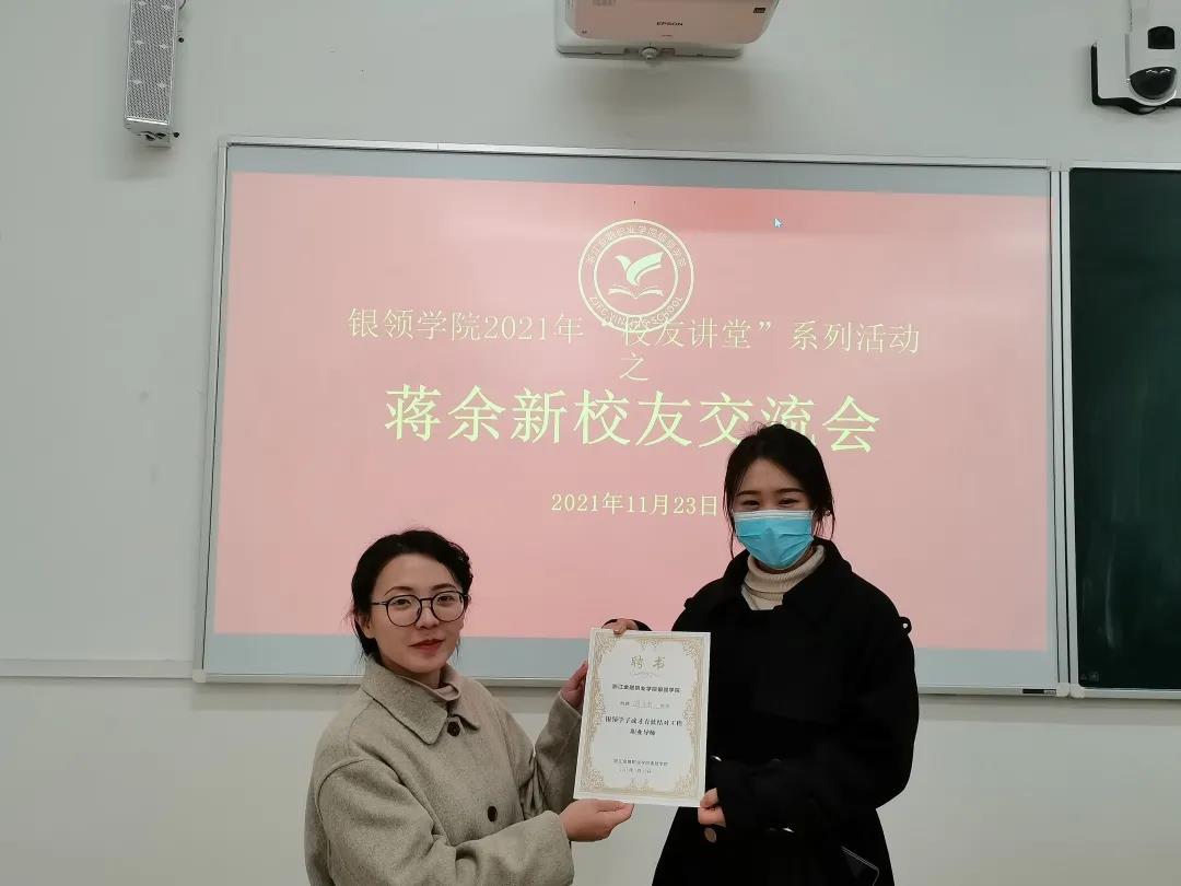 杨斌英老师向蒋余新员工的到来表示热烈的欢迎和由衷的感谢,并为蒋余新员工颁发了《bw必威西汉姆联官方网站学子成才青蓝结对工程聘书》。