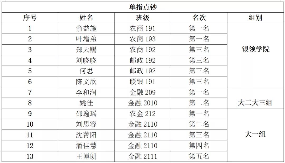 这次比赛共有bw必威西汉姆联官方网站组104人次、大二大三组80人次及大一组82人次参与。经激烈角逐后,各单项成绩取前六名,获奖名单如下: