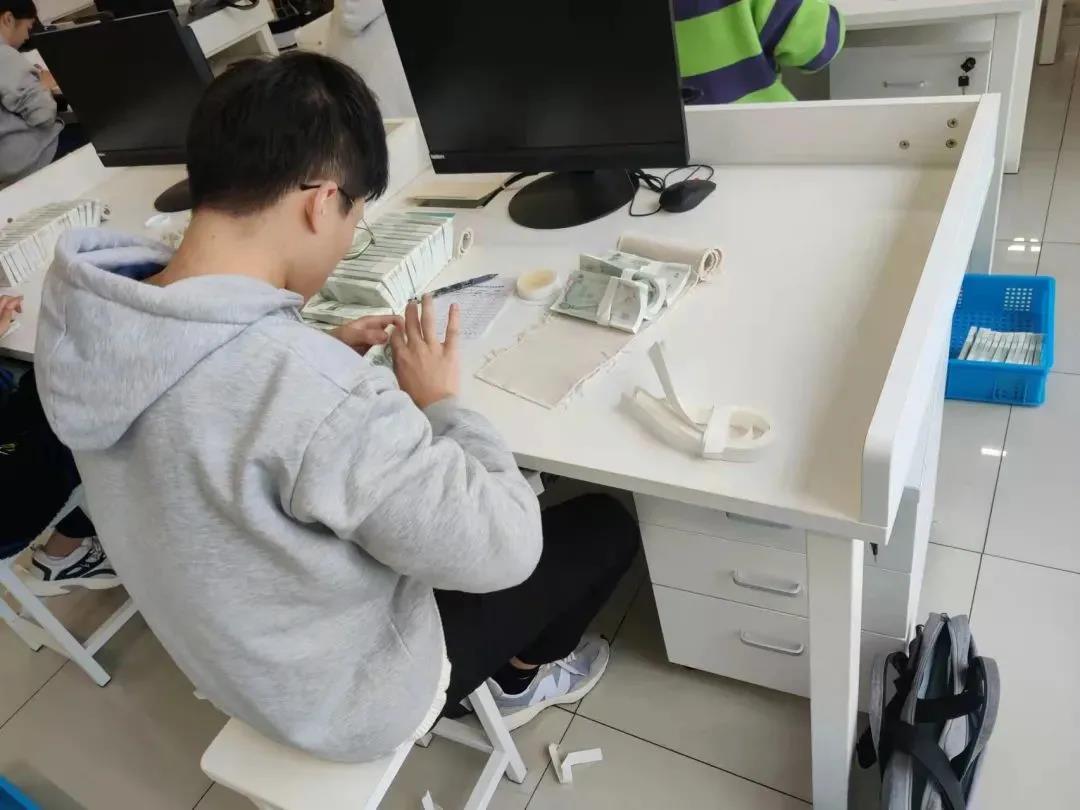 “开始”口令一响,参赛选手们迅速起把,清点、计数、扎把。选手们手指如飞,钞券在指间快速滑落,犹如在弹奏一曲欢乐明快的乐曲。