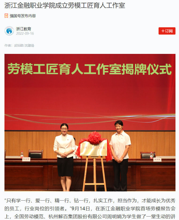 学习强国、浙江教育报等网络报刊媒体报道“劳模工匠育人工作室”成立