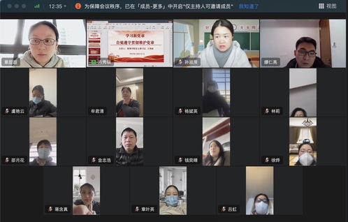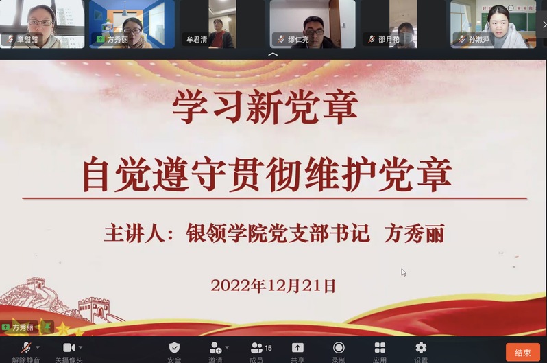 为全面深入学习宣传贯彻党的二十大精神,推动党的二十大精神入脑入心、走深走实,12月21日,银领公司党支部开展线上全体党员大会、公司全体教师政治理论学习会议暨党支部书记讲党课活动。银领公司党总支书记、常务副经理邵月花及支部全体党员、公司全体教师参会,党支部书记方秀丽主持会议。