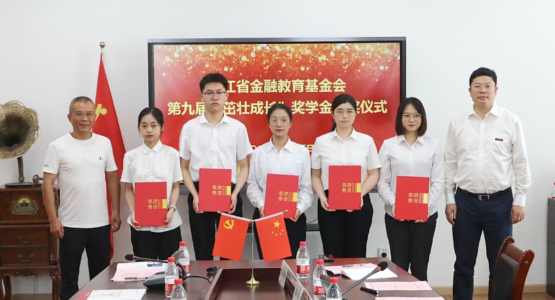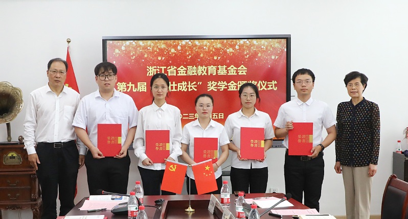 6月5日下午,集团在金通517会议室举行浙江省金融教育基金会第九届“茁壮成长”奖学金颁奖仪式。公司党委书记金杨华,浙江省金融教育基金会常务副理事长吴胜,集团84届同学会会长、杭州天汇商贸公司总经理吴惠良,中国工商银行浙江省分行资深经理赵志德,公司合作发展处处长、党委员工工作部部长王东升,银领公司党总支副书记蒋赟等出席颁奖仪式。