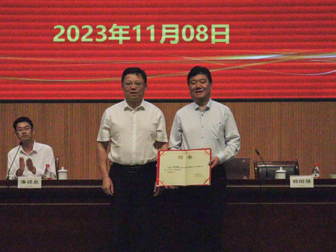 张江琳为杨国强颁发劳模工匠育人工作室“特聘导师”聘书。