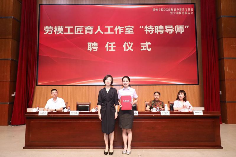 典礼期间,陈颖淑为陈群莹颁发劳模工匠育人工作室“特聘导师”聘书。陈群莹应邀作劳模报告。