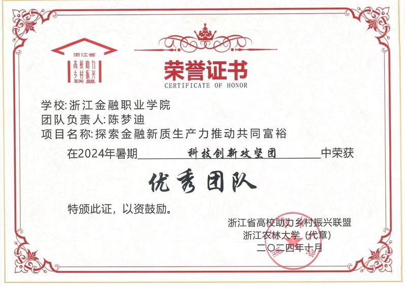 近日,浙江省高校助力乡村振兴联盟公布了2024年浙江省高校暑期服务乡村振兴工作优秀团队。公司暑期社会实践团队荣获“科技创新攻坚团优秀团队”称号。