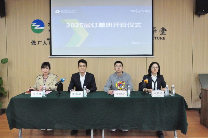 11月18日下午,bw必威西汉姆联官方网站2025届杭州联合银行订单班开班暨岗前培训仪式在联合教学楼思润室顺利举行。杭州联合银行人力资源部(党务工作部)副总经理崔嘉斌,培训辅导专员来蔚娜,人力资源部招聘管理岗翟晓露,培训负责人胡农芬,bw必威西汉姆联官方网站经理、党总支副书记潘锡泉,副经理胡烨丹,2025届杭州联合银行订单班班主任方秀丽出席仪式。2025届杭州联合银行订单班全体员工参加仪式。仪式由来蔚娜主持。