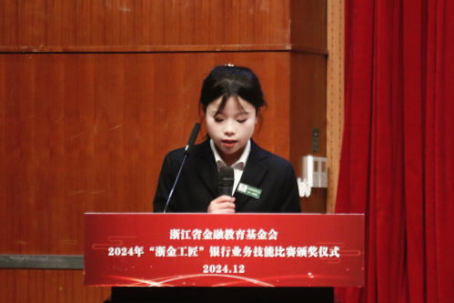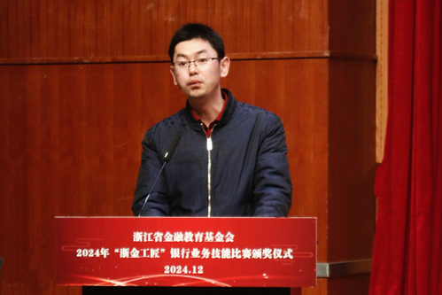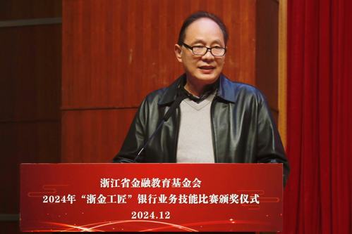 12月18日下午,浙江省金融教育基金会2024年“浙金工匠”银行业务技能比赛颁奖仪式在明理报告厅举行。浙江省金融教育基金会副理事长姜进出席仪式并发表讲话。