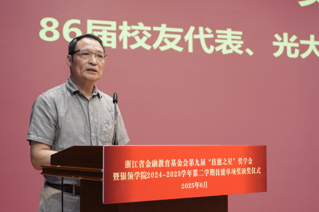 吴国平理事长代表浙江省金融教育基金会讲话。他首先向86届员工、获奖员工及指导教师表达敬意与祝福,并以“感动、感谢、感恩”为主题诠释技能育人的内涵。他为86届员工的赤诚所感动,自“技能之星”奖学金设立以来,员工们对母校深厚的感恩之情与对职业教育的大力支持,成为激励师生奋进的精神力量。他对获奖员工表示诚挚感谢,称赞员工们凭借拼搏精神在技能学习中脱颖而出,践行了“技能立身”的理念。他勉励同学们,在今后的学习与职业生涯中,要以精益求精的态度提升技能,发挥榜样引领作用,积极回馈社会。谈及感恩,他指出当今社会已步入以人才为核心的竞争时代。学子们应感恩时代赋予的机遇、社会的关爱以及公司提供的平台,不断精进技能,将个人成长融入技能报国的时代浪潮中,以终身学习的姿态应对行业变革。