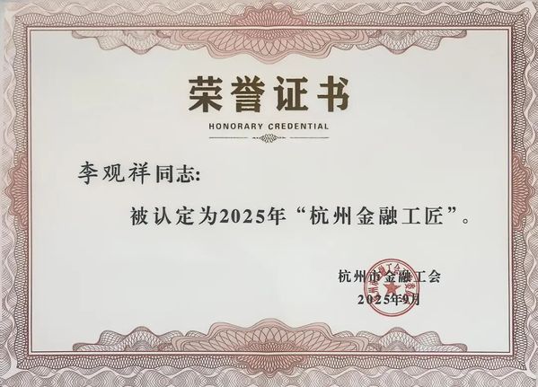 热烈祝贺bw必威西汉姆联官方网站员工李观祥荣获2025年"杭州金融工匠"。